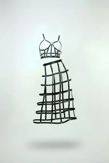 Crafted for impact, this leather skirt showcases intricate cross detail straps that form a striking cage pattern over the thigh area. The meticulous design work on this mini-skirt ensures it catches the light and the eye from every angle. It pairs effortlessly with other accessories like a Body Harness or a stylish Choker, allowing you to instantly elevate your look. The ultra-short length and open straps demand attention, making this an essential piece for clubs, concerts, or themed parties.