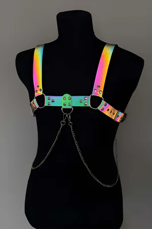 Stylish Men's Chest Harness with Rainbow Reflective (Glow in the Dark) Chain Detail, Reflective Clubwear - APFTM109