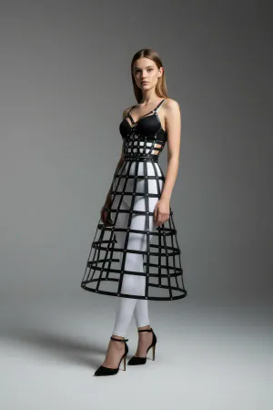 Black Women's Skirt Faux Leather Skirt Cage Structure Midi Length Leather Skirt - APFT1013