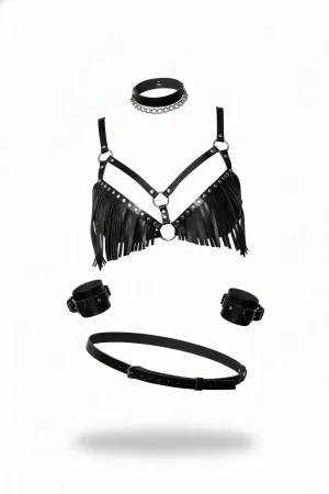 Black Harness Suit with Tassels and Studded Ring Detail - APFT896