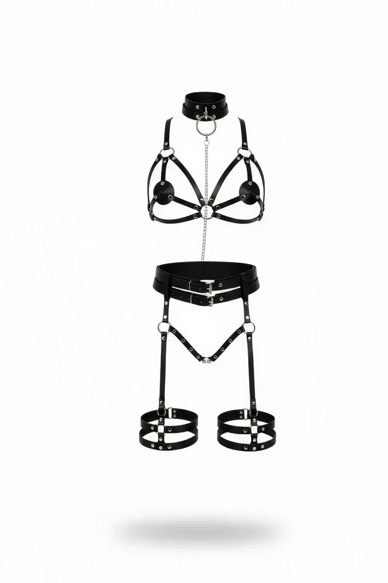 Black Harness Suit Leather Chain Detailed Body Accessory - APFT456