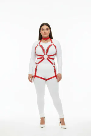 Plus Size Red Women's Leather Harness Set with Chain and Garter Detail - APFT781