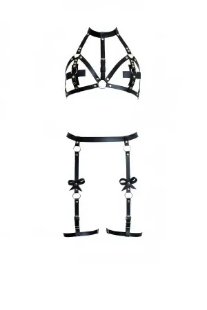 Black Suspender Harness Leather Neck Bow Detailed Suit - APFT310
