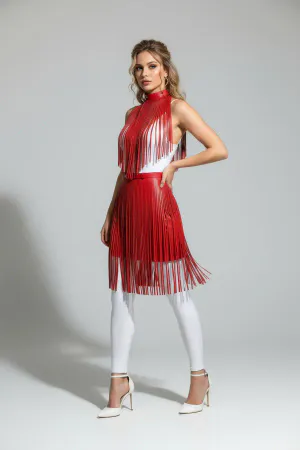 Red Skirt with Leather Tassels and Long Maxi Belt - APFT1003