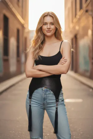 Plus Size Black Leather Belt Corset Style Skirt Detailed with Tassels - APFT985