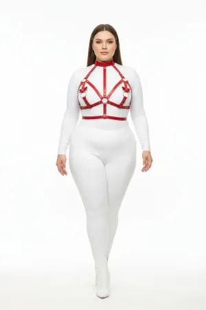 Plus Size Red Women's Harness Suit with Leather Chest Accessory and Ring Detail - APFT473