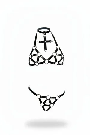 Black Leather Garter Harness Fancy Underwear Set