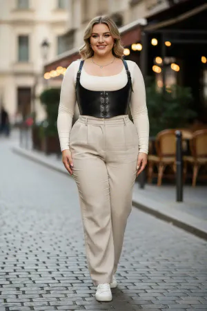 Plus Size Tan Women's Leather Corset with Belt and Shoulder Straps - APFT1428