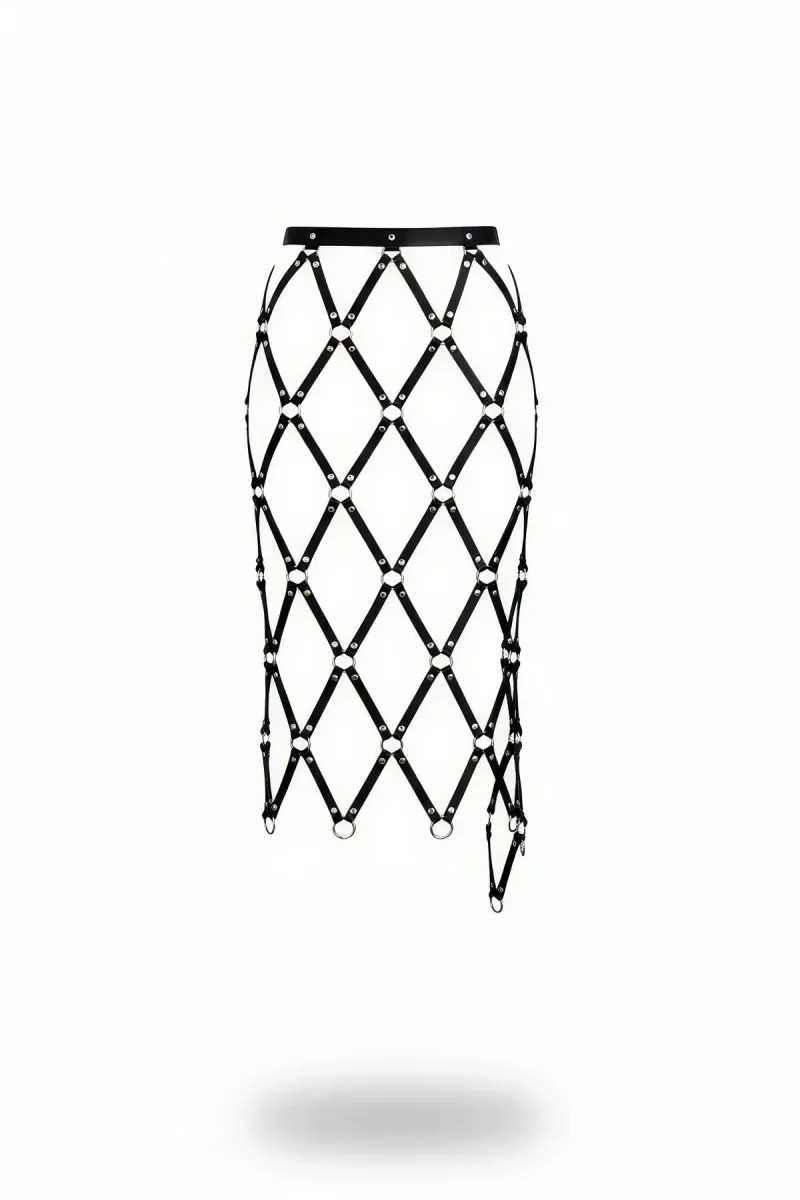 Black Skirt with Leather Strips and Metal Ring Detail - APFT410