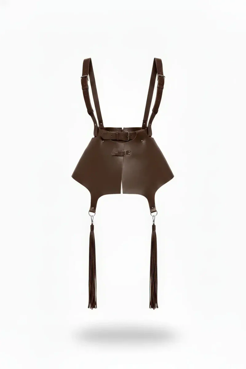 Brown Skirt Leather Shoulder Tie Tassel Mini Skirt - APFT787