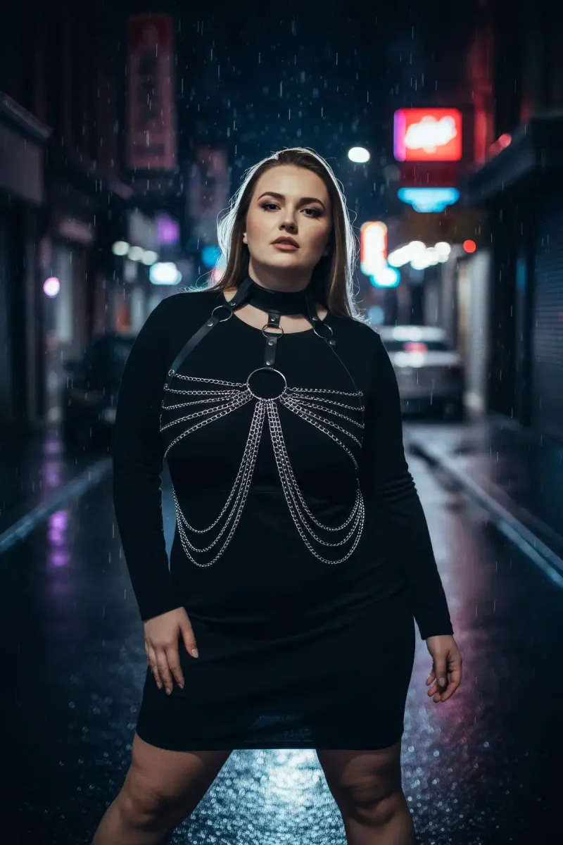 Plus Size Black Women's Belt Chain Detailed Leather Body Accessory - APFT463