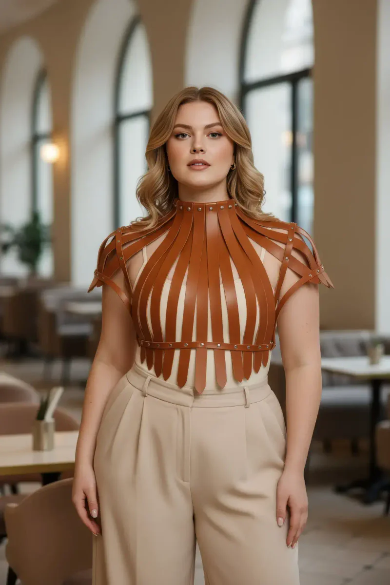 Plus Size Tan Women's Belt Shoulder Strap Staple Detailed Corset Design - APFT1257